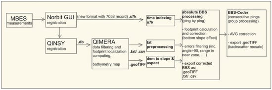 Data processing workflow from MBES raw data toward absolute BBS and fully georeferenced mosaic including corrections for intensity values corresponding to angle of incidence on the bottom (BBS-Coder).