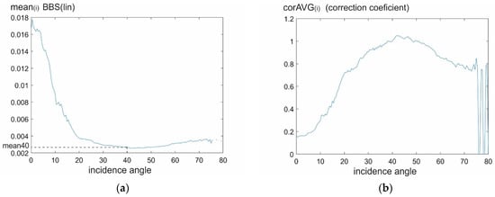 where corAVG(i) is the value of correction for i incidence angle, i = 0°, 0.5°, 1°, 1.5°, 2°, 2.5°, … 90°, mean40 is the average value of 10^(BBS/10) for an angle of incidence of 40°, and mean(i) is the average value of 10^(BBS/10) for angle of incidence i.
