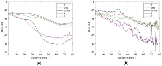 We calculated the angular response curves of absolute BBS for the specific habitat of the Baltic Sea occurring in the studied area: S, sand; SG-GS, sandy gravel or gravelly sand; B, boulders; R, red algae on boulders; VFS, very fine sand. Figure 9a shows the dependence of BBS on the angle of incidence, for which the values are averaged for the measurements made in the areas where homogeneous habitats occur, according to the separations from the map of habitats according to Janowski et al. [] (Figure 6) for 150 kHz. Figure 9b shows the angular response curves of BBS values. The values are averaged for measurements made within a 3 m radius of the sampling points for 150 kHz.