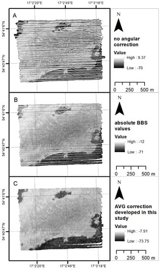 Other useful backscatter mosaics with smoothed backscatter outcomes without angular dependency can be created using Geocoder []. The near 0° incidence angle represents a stronger signal standard deviation. Median filtering of BSS near the 0° incidence angle might be a good solution. Geocoder assigns quality flags to backscatter samples. Data samples closer to and further from the nadir have low values, while samples in the middle range have higher values and a greater influence on the final backscatter mosaic []. When our MBES data were recorded with a large overlap, all values found in the raster grid were averaged to generate the mosaic. The BBS-Coder presented here is less complex than the current Geocoder in FMGT QPS software; it is simple and effective, and it will be freely available on the ECOMAP project website (https://www.bonus-ecomap.eu/, accessed on 1 January 2021). The AVG correction scheme presented in this paper assumes the use of a radiometric and geometric correction tool (in this case, QPS Qimera software).
