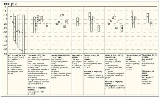 To compare our results on BBS measurements with those recently reported by other researchers, we summarized the basic information on the particular works in Figure 11. In general, the results obtained in this work on the dependence of BBS on the angle of incidence are in line with those achieved by other authors who performed MBES measurements [,], as well as the theoretical predictions.