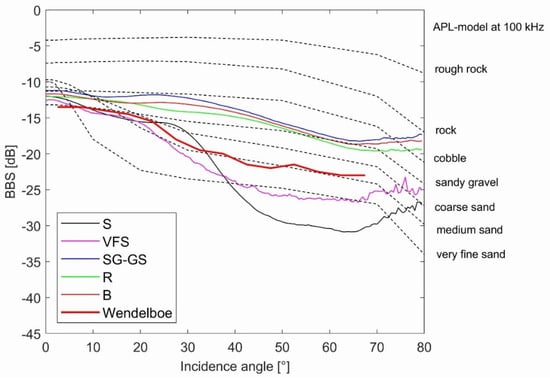 Dependence of BBS at 150 kHz on incidence angle for sand (S), very fine sand (VFS), sandy gravel or gravelly sand (SG-GS), red algae on boulders (R), and boulders (B) and seabed backscattering strength values estimated from Wendelboe [] obtained at a frequency of 190 kHz for medium fine sand. Dashed lines: BBS for different sediment type with APL model at 100 kHz [].