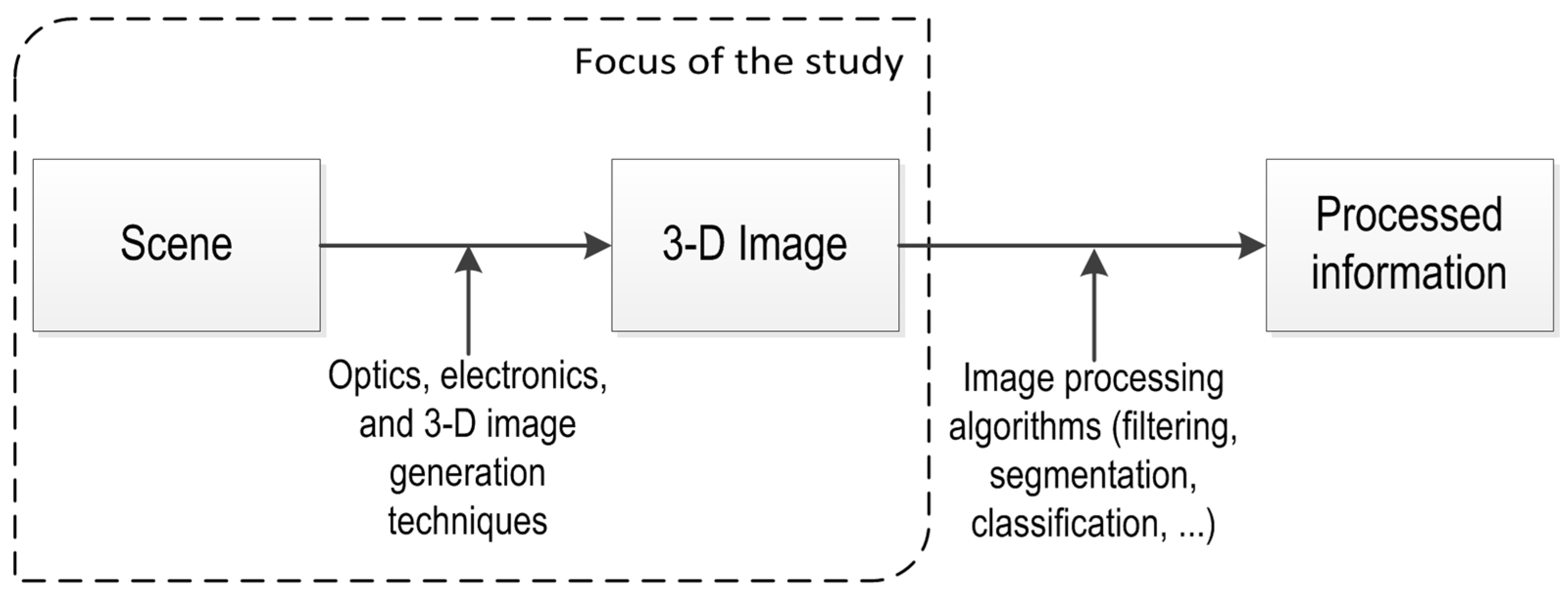 In 3-D vision systems, a single image of a scene contains huge amounts of information where recovery of depth information is complex. The depth of information is lost in the projection from the 3-D world to the 2-D imaging surface [6]. Due to the extra dimension, a 3-D image increases in the amount of data that needs to be handled, and as a consequence increases the significance of the 3-D image generation techniques. These techniques are vital for handling the extraction of depth information. This is particularly evident in the triangulation techniques where algorithms get a collection of images of a scene and extract the 3-D information out of it [7]. Figure 1 distinguishes between 3-D generation and image processing techniques. 3-D image generation techniques are critical for producing useful 3-D raw data. On the other hand, 3-D image processing techniques are important for processing information out of the 3-D image. They are not considered in the present study since they are highly dependent on the 3-D raw data quality.