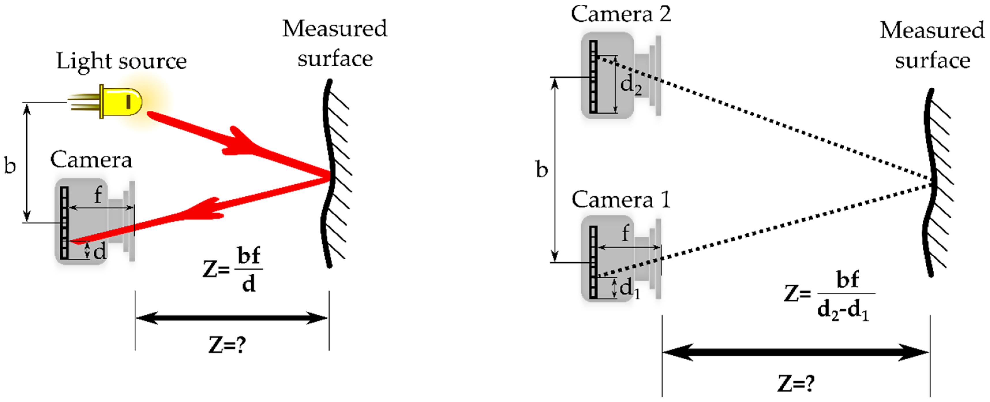 Schematic representation of light beam (left) and stereo vision (right) triangulation. “Z”, depth; “b”, baseline length; “d”, position of the incoming light beam on the image sensor; and “f”, focal length.