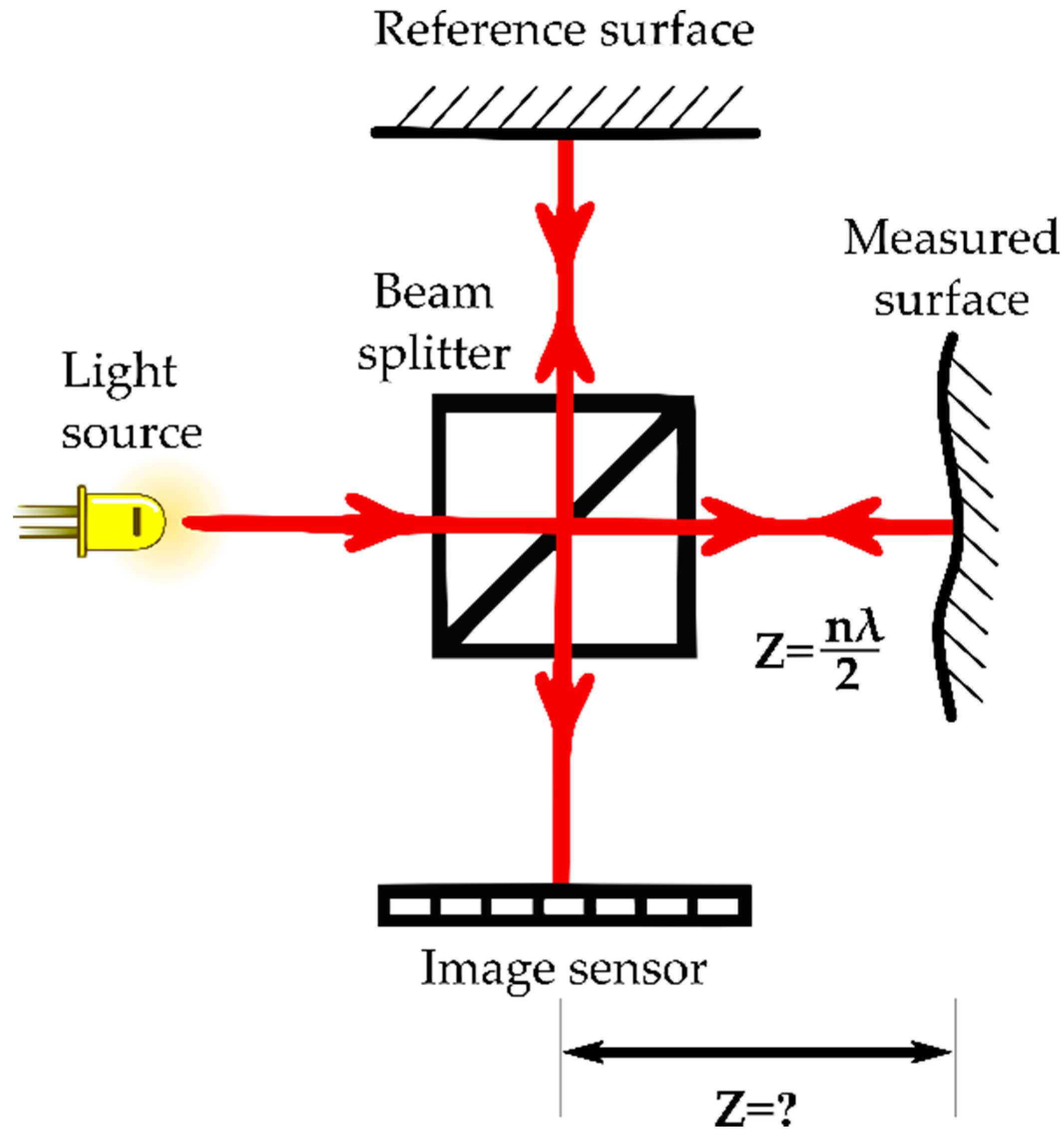 Schematic representation of a Michelson interferometer where the relative depth “Z” is directly proportional to the wavelength of the light source “λ” and to the number of fringes “n”.
