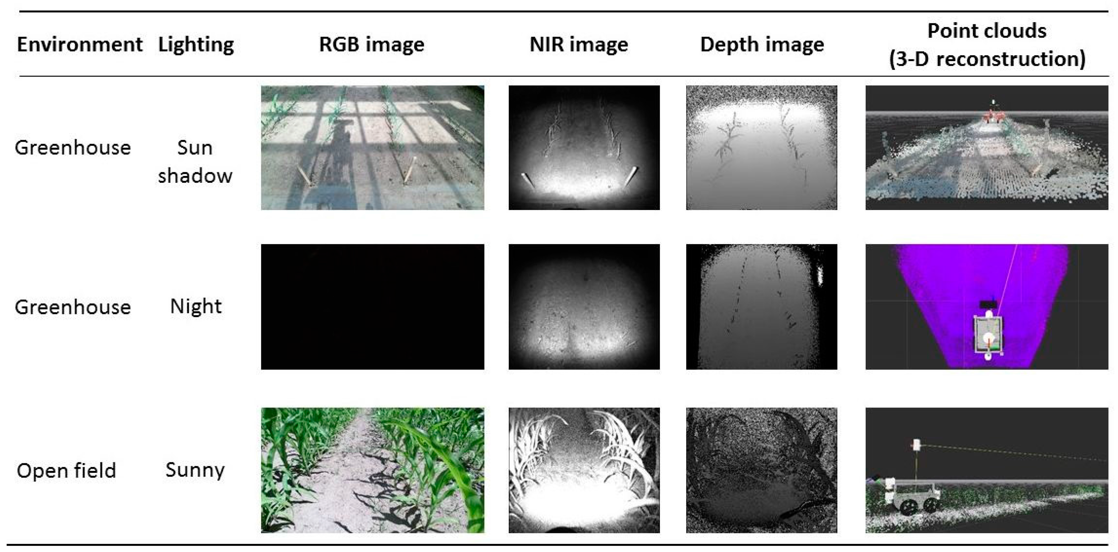 Reconstruction of maize plants using a CTC mounted on a field robot in different agricultural environments (reproduced from [114]).