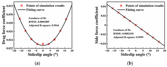 The sideslip angle is one of the parameters that have the greatest impact on the UAV due to external wind interference, and it can affect a number of aerodynamic parameters of the fixed-wing UAV, which we can see in Figure 3. The drag force, side force, roll moment and yaw moment coefficients are plotted versus the sideslip angle in Figure 3. In the range of sideslip angle of −20° to 20°, the drag force coefficient uses quadratic fitting, and the other coefficients use linear fitting.
