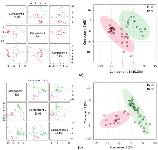 The identified metabolites were further ranked by the PLS-DA Variable Importance in Projection (VIP) score (Figure 2, Supplementary Figure S4). Here, up to and including the top 30 ranked significant metabolites were identified and their relative concentrations in B+ and B− samples indicated. Uniquely among all the VIP analyses, the top 30 metabolites were decreased in the B− and increased in the B+ Thai samples (Figure 2a).