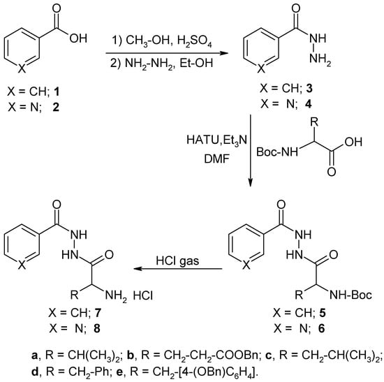 For the synthesis of the desired compounds, the sequence of reactions shown in Scheme 1 was followed. The reaction of benzoic acid hydrazide (3) with different N-Boc-L-amino acids in dimethylformamide in the presence of triethylamine (Et3N) as a base and N-[(dimethylamino)-1H-1,2,3-triazolo[4,5-b]pyridin-1-yl-methyl-ene]-N-methylmethanaminium hexafluorophsphate N-oxide (HATU) as coupling reagent at 0°C gave the desired compounds 5a-5e. The structures of compounds 5a-5e were established by means of IR, 1H-NMR, 13C-NMR, and elemental analyses. The infrared spectra of these compounds showed the absorption peaks of the urethane and the amide carbonyls in the 1715-1727 cm-1 and 1663-1693 cm-1 ranges, respectively, and the absorption peak of the N-H in the 3226-3336 cm-1 range. The 1H-NMR showed the presence of three exchangeable signals for the NH and the 13C-NMR detected the presence of one urethane carbonyl and two amide carbonyls in the 153-173 ppm range. Similarly, nicotinic acid hydrazide (4) was allowed to react under the same conditions with the same N-Boc-L-amino acids to give the desired compounds 6a-6e. The structures of compounds 6a-6e were also established by means of IR, 1H-NMR, 13C-NMR, and elemental analyses. Compounds 5 and 6 were subjected to N-deprotection by passing HCl gas into a solution of these compounds in methylene chloride/ether. The latter series upon deprotection of Boc group afforded the new series of compounds 7 and 8 (Table 1, Table 2).