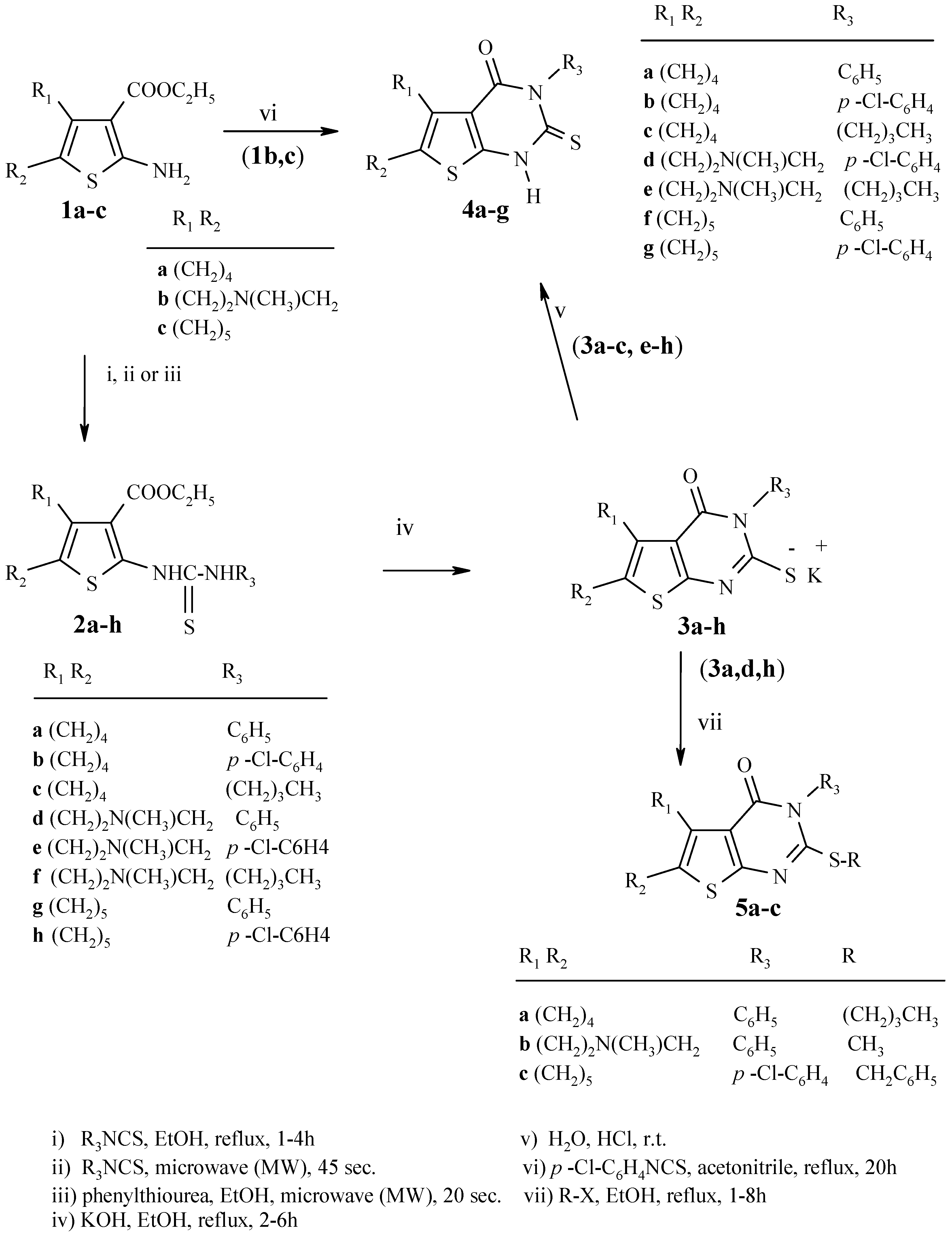 The starting materials, namely 2-amino-3-ethoxycarbonyl-4,5-disubstituted thiophenes 1a-c and 2-amino-3-cyano-4,5-disubstituted thiophenes 1d,e were prepared following the corresponding literature procedures [10,11,12]. Thienylthiourea derivatives 2a-h were prepared by condensation of the amino esters 1a-c with alkyl or aryl isothiocyanates, either by heating at reflux or under microwave irradiation [8,9,13]; the latter method afforded higher yields of the desired products in a shorter time.