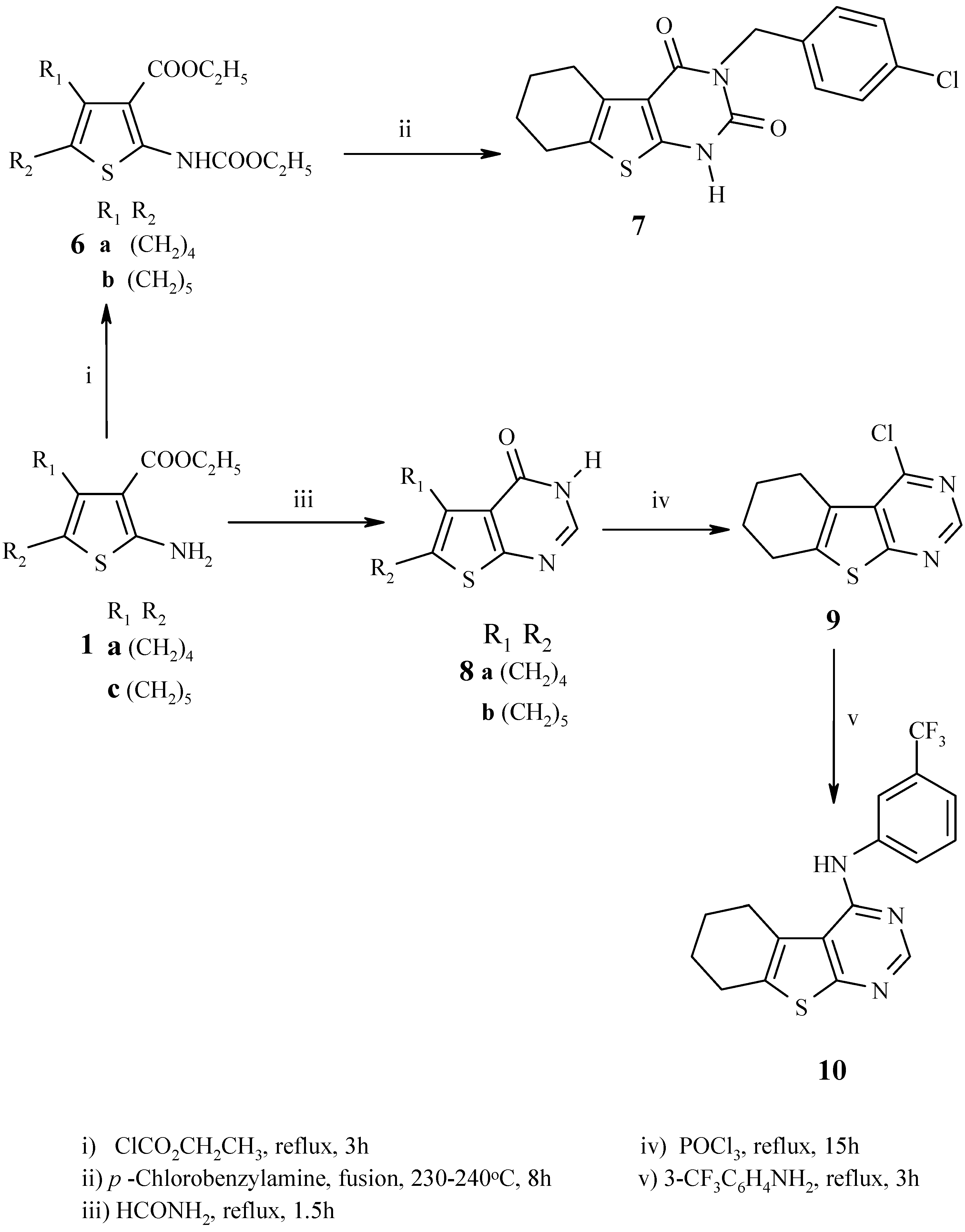 Condensation of the amino esters 1a,c with ethyl chloroformate gave the carbamate derivatives 6a,b, which were fused with p-chlorobenzylamine at 230-240°C to afford the dione derivative 7 [16]. The thienopyrimidinone derivatives 8a,b were prepared by cyclization of the corresponding amino ester with formamide. Nucleophilic aromatic substitution with POCl3 was carried out on 8a to give the 4-chlorothienopyrimidine derivative 9. Further substitution with an aromatic amine was carried out on this chloro derivative 9 to yield the 4-anilino derivative 10 (Scheme 2). The structures of compounds 1-10 were confirmed from their IR, 1H-NMR, 13C-NMR and MS spectral data.