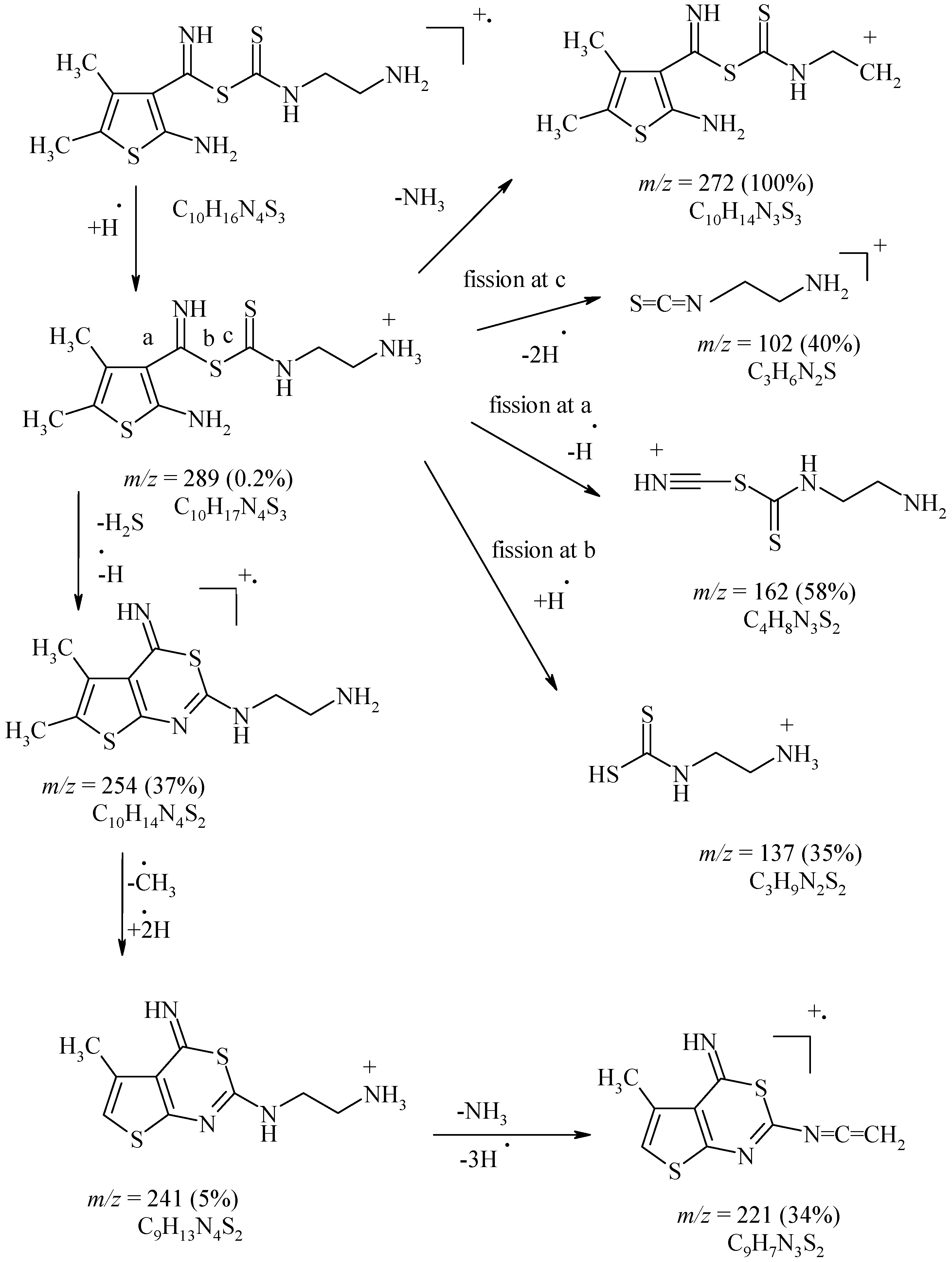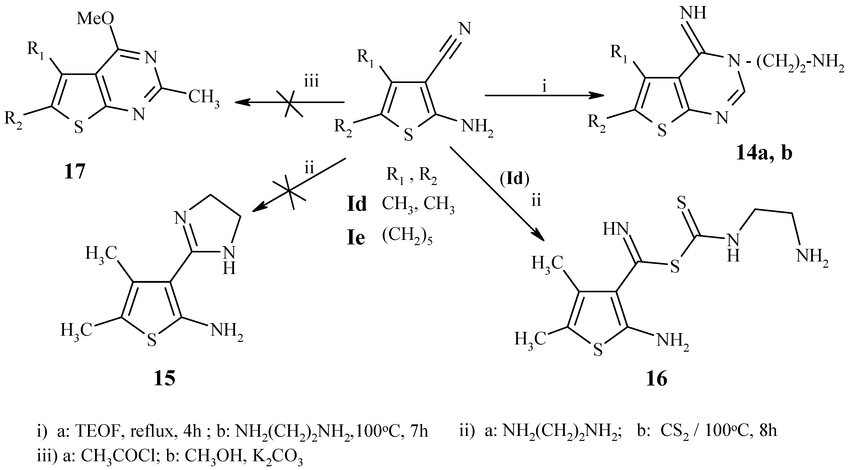 Treatment of 1d,e with triethyl orthoformate followed by ethylenediamine, yielded the 3-amino-ethyl-4-imino-derivatives 14a,b [20]. Compounds 13b and 14a,b could only be identified by their IR and MS spectra, as they are insoluble in the common solvents used in NMR. An attempt to prepare 2-amino-4,5-dimethyl-3-(4,5-dihydro-1H-2-imidazolyl)thiophene (15) following a published procedure [21], by reacting 1d with ethylenediamine and carbon disulfide did not yield the expected product 15 and instead the intermediate 16 was obtained (Scheme 4). This intermediate was insoluble in the common solvents used for NMR measurements; but it could be identified by its IR spectrum, which revealed the expected C=S absorption at 1207 cm-1, and by its MS spectral data (the general fragmentation patterns proposed for 16 are shown in Scheme 5). Attempts were also made to prepare 2-methyl-4-methoxythienopyrimidine 17 by reacting 1d,e with acetyl chloride followed with methanol according to a published procedure [20], however, the target compound was not obtained and only the starting material was recovered.