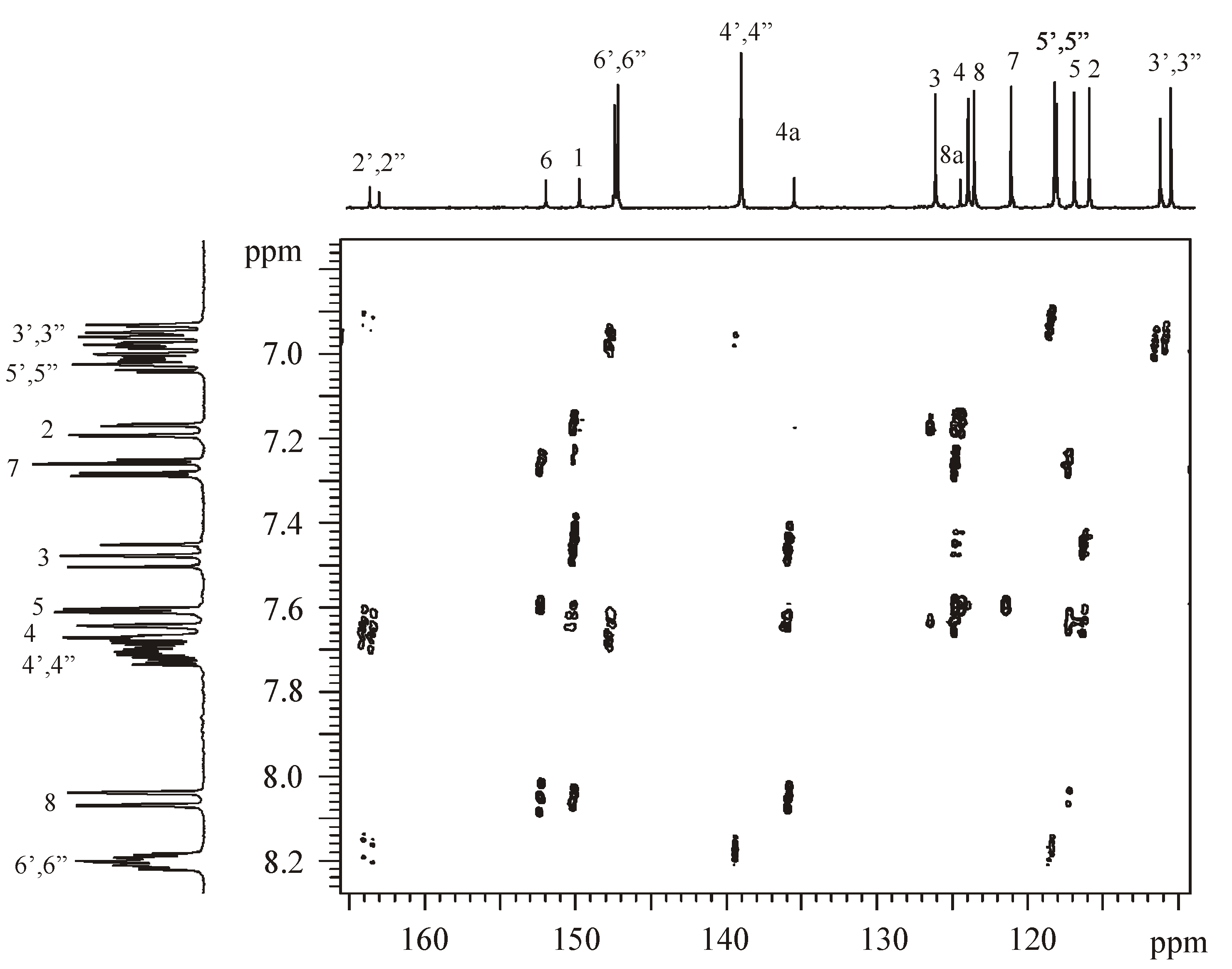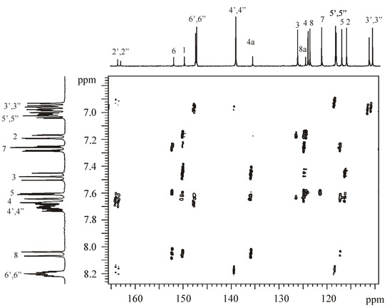 A subsequent 2D-GHSQC spectrum allowed assignment of the protonated carbon signals. Finally, the signals for the non-protonated carbons were assigned by means of a 2D-GHMBC spectrum (Figure 2). For example, the peak at 152.28 ppm correlates to H7, H5 (2JCH) and H8 and therefore can be assigned to C6, whereas the peak at 150.08 ppm correlates to H2 (2JCH), H7 (4JCH), H3, H5 (4JCH), and H8 and therefore can be assigned to C1. Similarly, distinction between C4a and C8a was made on the basis that the former shows correlations to H3, H4 (2JCH) and H8, whereas the latter correlates to H2, H7, H3 (4JCH), H5, and H4. The other correlations in this spectrum also served to confirm the earlier assignments of the other protons and carbons. The spectra of the other isomers were assigned by analogous methods.