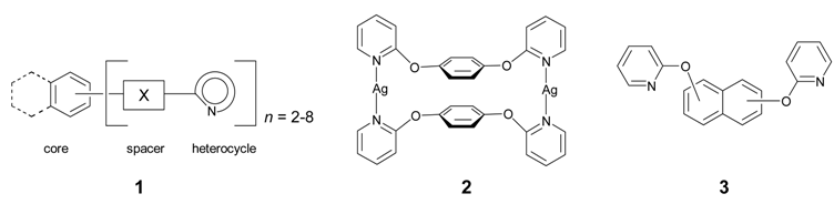 Over the last decade we have reported the synthesis and study of numerous compounds characterised by the schematic representation 1[1,2]. These are comprised of a central arene core to which are appended a number (n) of heterocyclic rings attached via spacer groups (X). Variation of the arene core, the spacer group, the nature of the heterocycle and the number n has led to an extensive library of bridging ligands that we have used for the construction of a diverse range of 1-, 2- and 3-D metallosupramolecular assemblies with various topological architectures. For example, the dimetallocyclophane 2, stabilised by internal π-π stacking of the central benzene rings, was formed by reaction of silver nitrate with 1,4-bis(2-pyridyloxy)benzene, which has a benzene core, an ether oxygen as spacer and (n = 2) 2-substituted pyridines as the appended heterocycles [3]. The analogous 3-pyridyl ligand provided access to the first quadruply stranded helicate [4], whereas the 1,2- and 1,3-disubstituted analogues led to a range of other interesting assemblies [5].