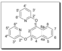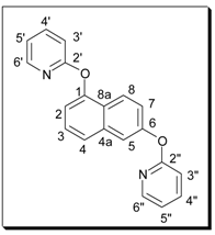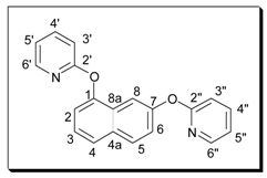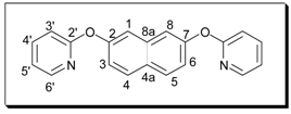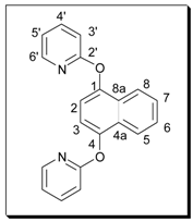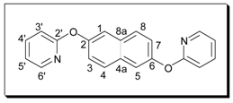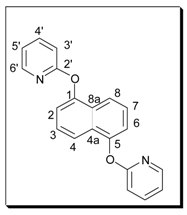 Method A: A mixture of the dihydroxynaphthalene (1 equiv.), 2-bromopyridine (3 equiv.) and potassium carbonate (4 equiv.) was refluxed in DMF for 72 hours. The mixture was added to a solution of aqueous sodium hydroxide (10%) and this was repeatedly extracted with chloroform. The chloroform was removed in vacuo and the resulting DMF solution was added to acetone. This solution was heated, treated with decolourising charcoal, then filtered. The solvent was then removed to give the crude product, which was purified by recrystallisation and/or column chromatography.