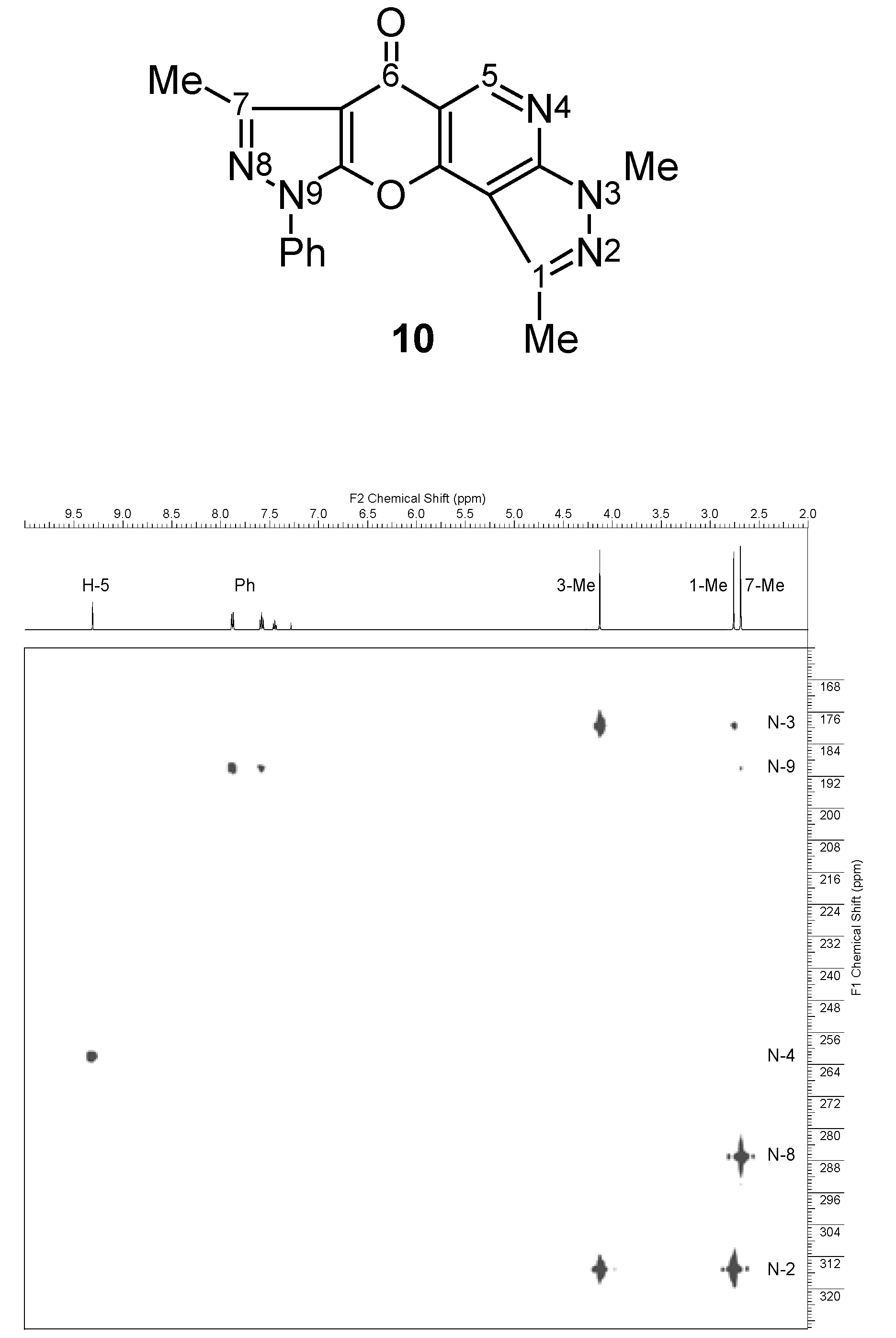 In most cases, assignment of 15N-NMR signals was easily made on basis of chemical shift considerations together with correlations emerging from the gs-HMBC spectra. As an illustrative example, the 15N,1H HMBC spectrum of compound 10 is displayed in Figure 4.