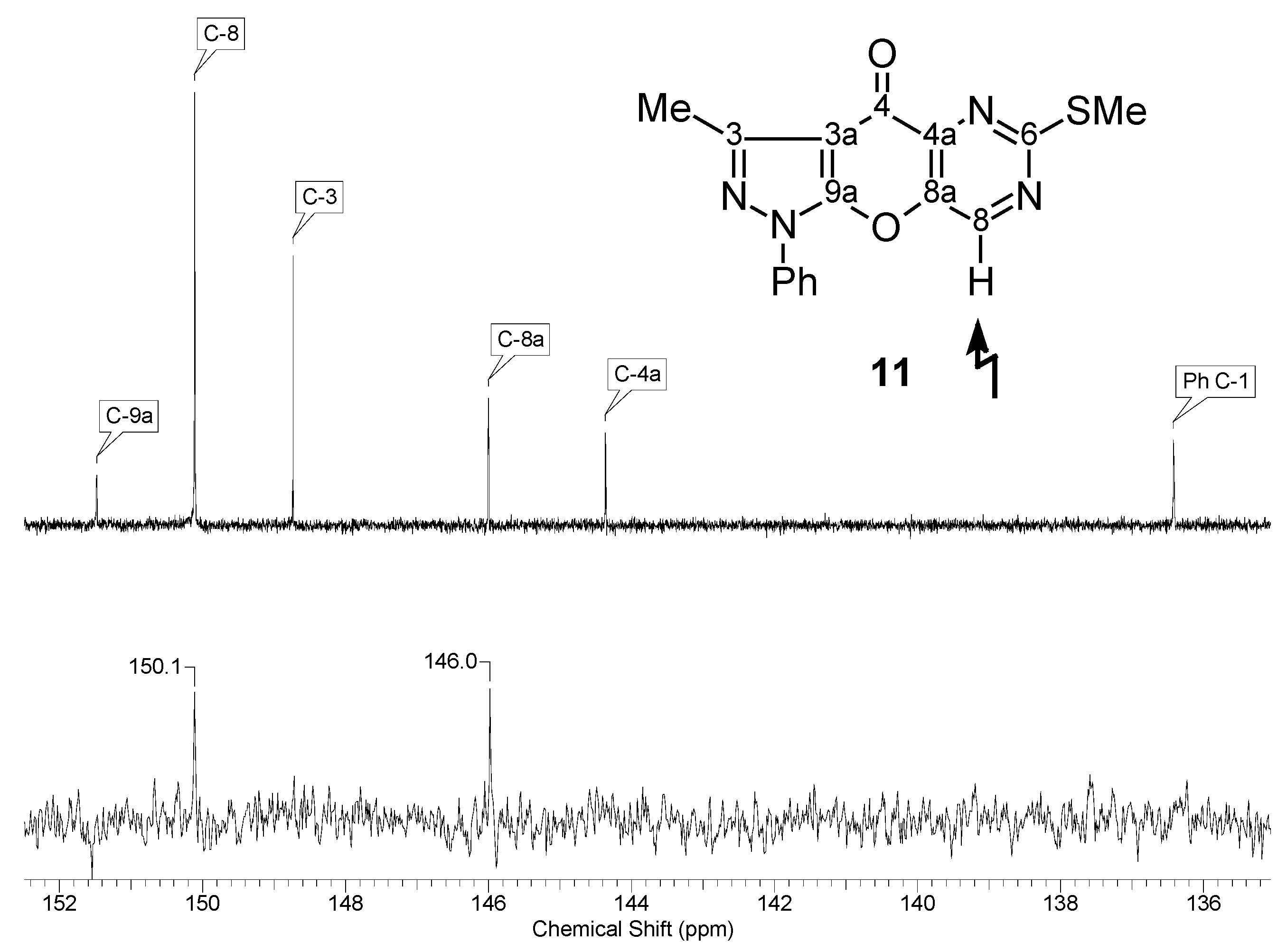 The assignment of the numerous lines due to quaternary carbon atoms has not been a trivial task. For instance, in target compounds 9–15, the chemical shifts of the two carbon atoms directly attached to the pyran oxygen atom often closely resemble each other. Despite this fact, an unequivocal distinction was possible on basis of the 1H-coupled 13C-NMR spectra. The signal of the carbon atom located between pyrazole N-1 and the pyran oxygen always appears as a singlet, whereas the signal of the opposite pyran O–C atom is split by couplings to protons belonging to the system condensed on the ‘right’ side of the pyran ring. In compound 14 this diagnostic coupling is small (3JC8b,H8=1.0 Hz) and emerges only after pronounced resolution enhancement. Discrimination of C-5a vs. C-8a in 14, C-5a vs. C-10a in 15, and C-5 vs. C-7 in 13 is based on the upfield shift of the latter signal in each pair due to the influence of the pyran oxygen atom. In the fused pyrimidine derivative 11 the discrimination of the lines due to C-4a and C-8a (144.4 ppm, 146.0 ppm) is not possible considering the 1H-coupled 13C-NMR spectrum, since both signals show a 3 Hz splitting due to coupling with H-8. Here, unambiguous assignment of C-8a was achieved via a heteronuclear 13C{1H} NOE-difference experiment. Irradiation of the H-8 transition only enhanced the signal of the spatially close C-8a whereas the line of the more distant C-4a remained unaffected (Figure 3).