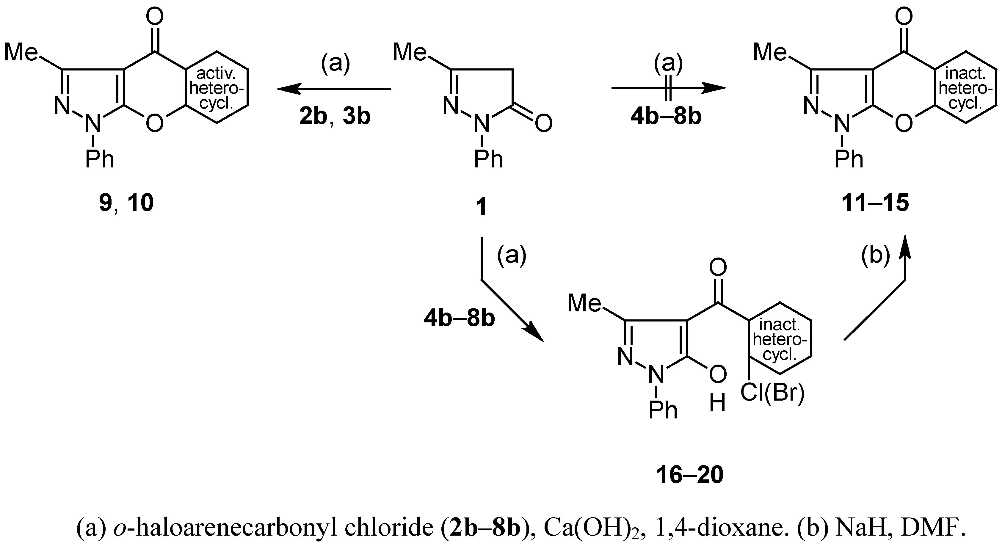 The purpose of this study is to report the convenient one- or two-step synthesis of novel heterocyclic ring systems (Table 1) containing a [5,6]pyrano[2,3-c]pyrazol-4(1H)-one moiety starting from commercially available educts. Thus, 2-pyrazolin-5-one 1 (a tautomer of 5-hydroxypyrazole [12]) was reacted with the corresponding o-haloarenecarbonyl chlorides 2b–8b (Figure 2) in the presence of excess calcium hydroxide in boiling 1,4-dioxane (the 'Jensen' method [13]) to affect the selective acylation at the pyrazole C-4. However, the target compounds 9 and 10 were directly obtained in the reaction of the acid chlorides 2b and 3b with pyrazolone 1, without isolation of the expected 4-aroylpyrazol-5-ols (Scheme 1).