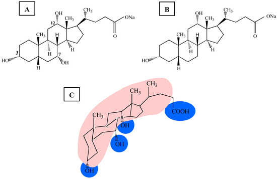 Chemical structure of the two bile salts: (A) sodium cholate (NaC) and (B) sodium deoxycholate (NaDC). Under physiological conditions (300 mOsmol, pH 7) bile salts are negatively charged. (C) Structural formula of sodium cholate showing the hydrophobic surface (indicated in red) and the hydrophilic parts (indicated in blue) of the molecule.
