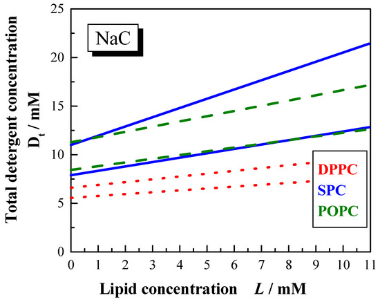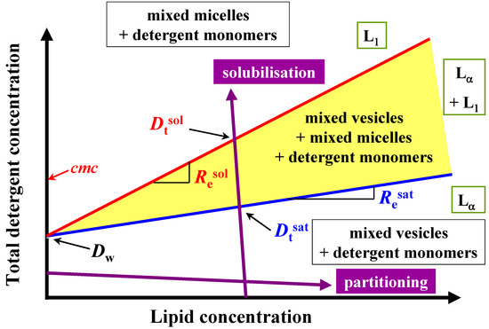 The phase boundaries of the membrane-to-micelle transition Dt# (‘#’ means ‘sat’ or ‘sol’ for saturation and solubilisation) are shown in Figure 2 as straight lines (blue line: saturation, red line: solubilisation) [59,72,73]. The morphology of the formed aggregates depends on the chemical structure of the components, however, the composition of the mixed aggregates is given by the effective (index e) detergent to lipid ratio Re# according to: