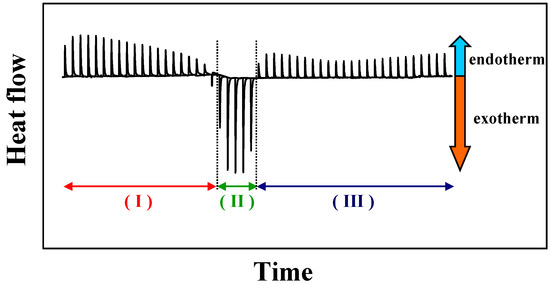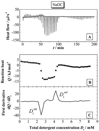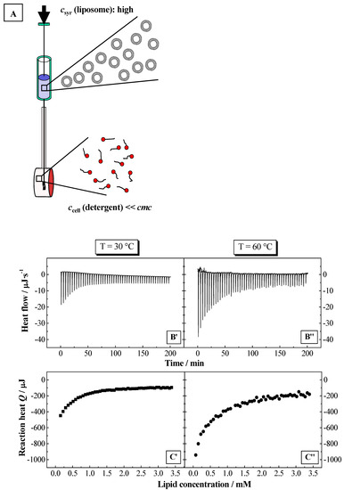 A typical ITC partition experiment is shown in Figure 3 [54,55,56,57,58]. The syringe is loaded with a highly concentrated phospholipid dispersions and injected into the detergent solution at a concentration lower than the cmc (Figure 3A). Figure 3B shows the titration partitioning experiment of NaC into soy bean phosphatidylcholine (SPC) vesicles in 0.1 M NaCl at T = 30 °C and T = 60 °C.
