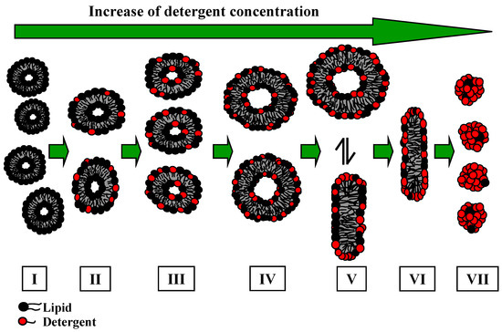 The titration of highly concentrated detergent solution into a liposome dispersion induces strong changes in the liposome morphology [41,66,67,68,69,70]. This is schematically represented in Figure 4. Various stages, denoted by I to VII, are shown. In the presence of very low amounts of detergent molecules, some are incorporated in the outer layer of the membrane (Figure 4II), and with further increases of the detergent concentration, the amount of membrane bound detergent increases. At this stage, there is a distribution of monomer detergent molecules (at concentrations below the cmc) between the lipid membrane phase and the bulk aqueous water phase and mixed vesicles are formed. Furthermore, a flip-flop process takes place [71], transporting the detergent to the inner layer of the membrane and vice versa until equilibrium is reached (Figure 4III). Due to the higher amount of total detergent and thus higher amount of incorporated detergent molecules in the liposome, the size of the liposome increases. This can be measured by DLS (see below). However, with increasing the total detergent concentration Dt, a critical detergent concentration Dtsat is reached where the mixed bilayers are saturated with detergent molecules (Figure 4IV) and the liposomes cannot incorporate more detergent molecules. As a consequence, the liposomes start to break up, change their morphology and fragment into mixed micelles (Figure 4V). Increasing the amount of detergent shifts the transformation form mixed vesicles to mixed micelles (Figure 4VI). Mixed aggregates of both species, liposomes and micelles, occur in the coexistence region (Figure 4V). With further increases of the detergent concentration a second critical detergent concentration Dtsol is reached (Figure 4VI), beyond which all liposomes have disappeared and the solubilisation is completed. The presence of extremely high detergent concentrations change the morphology of mixed micelles as has been described in the literature. Lasch [21,41] differentiates between lipid-rich mixed micelles (Figure 4VI) and detergent-rich mixed micelles (Figure 4VII) with smaller particle sizes, which are observed at high detergent to lipid ratios. In all stages (I-VII) shown in Figure 4 the aggregates coexist with detergent monomers.