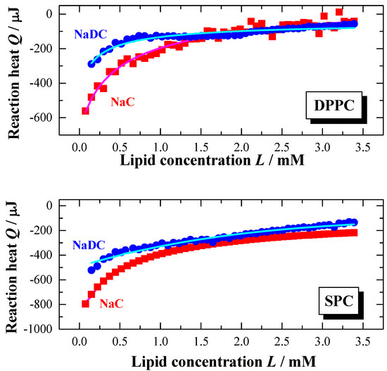 Partition experiment: Titration of a lipid dispersion (syringe) of a concentration of 20 mM, DPPC (top) and SPC (bottom), into a NaC (10 mM) or NaDC (4 mM) solutions in water at T = 60 °C (pH 7.5). Injection scenario: 50 injections à 5 μl. The plots represent the change in reaction heat Q of each injection versus lipid concentration L in the cell (adapted from [56,59]). The full lines were obtained from simulations using the partition model described in the text.