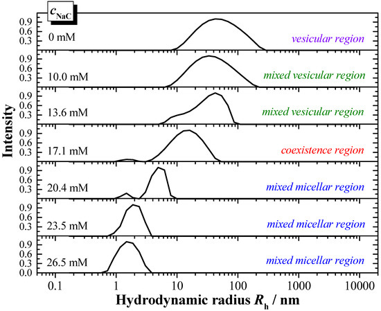 - Majhi, P. R.; Blume, A. Temperature-induced micelle-vesicle transitions in DMPC-SDS and DMPC-DTAB mixtures studied by calorimetry and dynamic light scattering. J. Phys. Chem. B 2002, 106, 10753–10763. [Google Scholar]