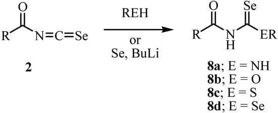 - Koketsu, M.; Yamamura, Y.; Aoki, H.; Ishihara, H. The preparation of acylselenourea and selenocarbamate using isoselenocyanate. Phosphorus Sulfur Silicon Relat. Elem. 2006, 181, 2699–2708. [Google Scholar] [CrossRef]