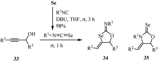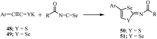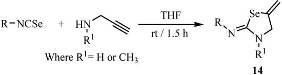 - Koketsu, M.; Sakai, T.; Kiyokuni, T.; Garud, D. R.; Ando, H.; Ishihara, H. One-pot synthesis of 2-imino-1,3-selenazolidines by reaction of isoselenocyanates with propargylamine. Heterocycles 2006, 68, 1607–1615. [Google Scholar] [CrossRef]