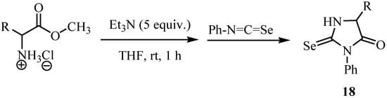 - Koketsu, M.; Takahashi, A.; Ishihara, H. A facile preparation of selenohydantoins using isoselenocyanate. J. Heterocycl. Chem. 2007, 44, 79–81. [Google Scholar] [CrossRef]