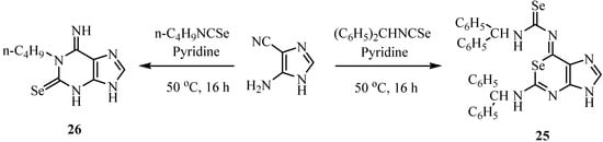 - Matsumoto, H.; Hara, S.; Nagata, N.; Ikeda, K.; Mizuno, Y. Synthesis of new 1-chalcogenapurines by the reaction of 5-aminoimidazole-4-carbonitrile with isochalcogenocyanates. Heterocycles 1995, 41, 47–56. [Google Scholar] [CrossRef]