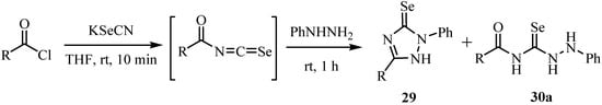 - Koketsu, M.; Yamamura, Y.; Ishihara, H. Synthesis of selenosemicarbazides and 1,2,4-triazoles. Heterocycles 2006, 68, 1191–1200. [Google Scholar] [CrossRef]
