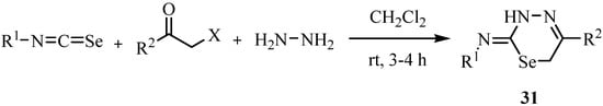 - Sommen, G. L.; Linden, A.; Heimgartner, H. Selenium-containing heterocycles from isoselenocyanates: Use of hydrazine for the synthesis of 1,3,4-selenadiazine derivatives. Helv. Chim. Acta 2006, 89, 1322–1329. [Google Scholar] [CrossRef]