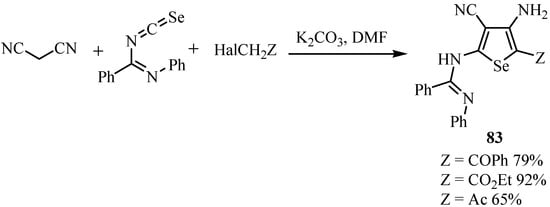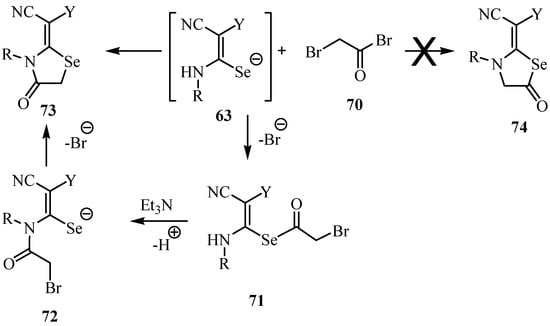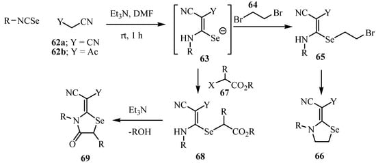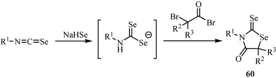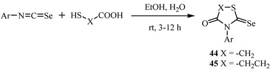 - Sommen, G. L.; Linden, A.; Heimgartner, H. Synthesis of 2-selenoxo-1,3-thiazolidin-4-ones and 2-selenoxo-1,3-thiazinan-4-ones from isoselenocyanates. Heterocycles 2005, 65, 1903–1915. [Google Scholar] [CrossRef]