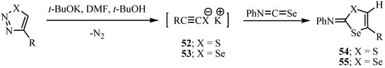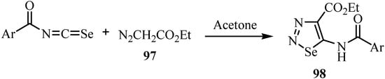 - Zhou, Y.; Heimgartner, H. Selenium-containing heterocycles from isoselenocyanates: Synthesis of 1,2,3-selenadiazole derivatives. Helv. Chim. Acta 2000, 83, 539–553. [Google Scholar] [CrossRef]