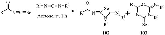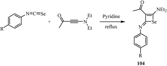 - Koketsu, M.; Otsuka, T.; Ishihara, H. Synthesis of 1,3-selenazetidine derivatives from imines and thiocarbamoyl isoselenocyanate. Heterocycles 2006, 68, 2107–2112. [Google Scholar] [CrossRef]