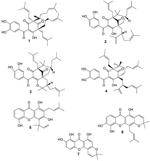 Bioguided investigation of these extracts resulted in the isolation and characterization of four benzophenones, guttiferone A (1) [3], garcinol (2), cambogin (3) [2] and guttiferone F (4) [4], along with three xanthones, allanxanthone A (5) [5], xanthone V1 (6) and globulixanthone C (7) [6] (Figure 1). Compounds (1) and (6) were isolated from S. globulifera leaves, as compounds (2-5) were obtained from A. monticola fruits.