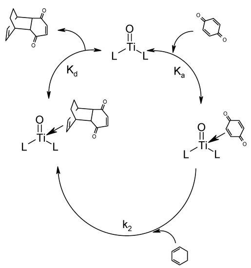 In order to clarify the role of GnCl, Kuroda investigated related additives and postulated that hydrogen bonding between GnCl and 1,4-benzoquinone accounted for the increased conversion. This explanation was consistent with that of Engberts et al. Engberts postulated that hydrogen bonding withdraws electron density from the double bond of the dienophile, thereby lowering the LUMO energy and facilitating interaction with the diene HOMO [5d]. The mechanism for Lewis acid catalyzed DA reactions is analogous to the effect of hydrogen bonding. Given the immediate and rapid association of benzoquinone with the added catalyst, the insolubility of the resulting DA product, and the increased conversion in the catalyzed reaction, the mechanism of reaction likely follows that first postulated by Engberts for the aqueous catalytic DA reaction (Scheme 2) [5d]. The mechanism likely involves: i) dative coordination of the dienophile to Ti(IV) that withdraws electron density from the double bond of BQ which ii) activates BQ towards interaction with 1,3-cyclohexadiene, iii) after the irreversible DA reaction, iv) the product dissociates from the complex, regenerating the active metal species. Exactly how the dienophile coordinates remains to be determined as either dative coordination via the quinoidal oxygen or the alkenyl moiety are both possible and both are likely to reduce electron density at the double bond.