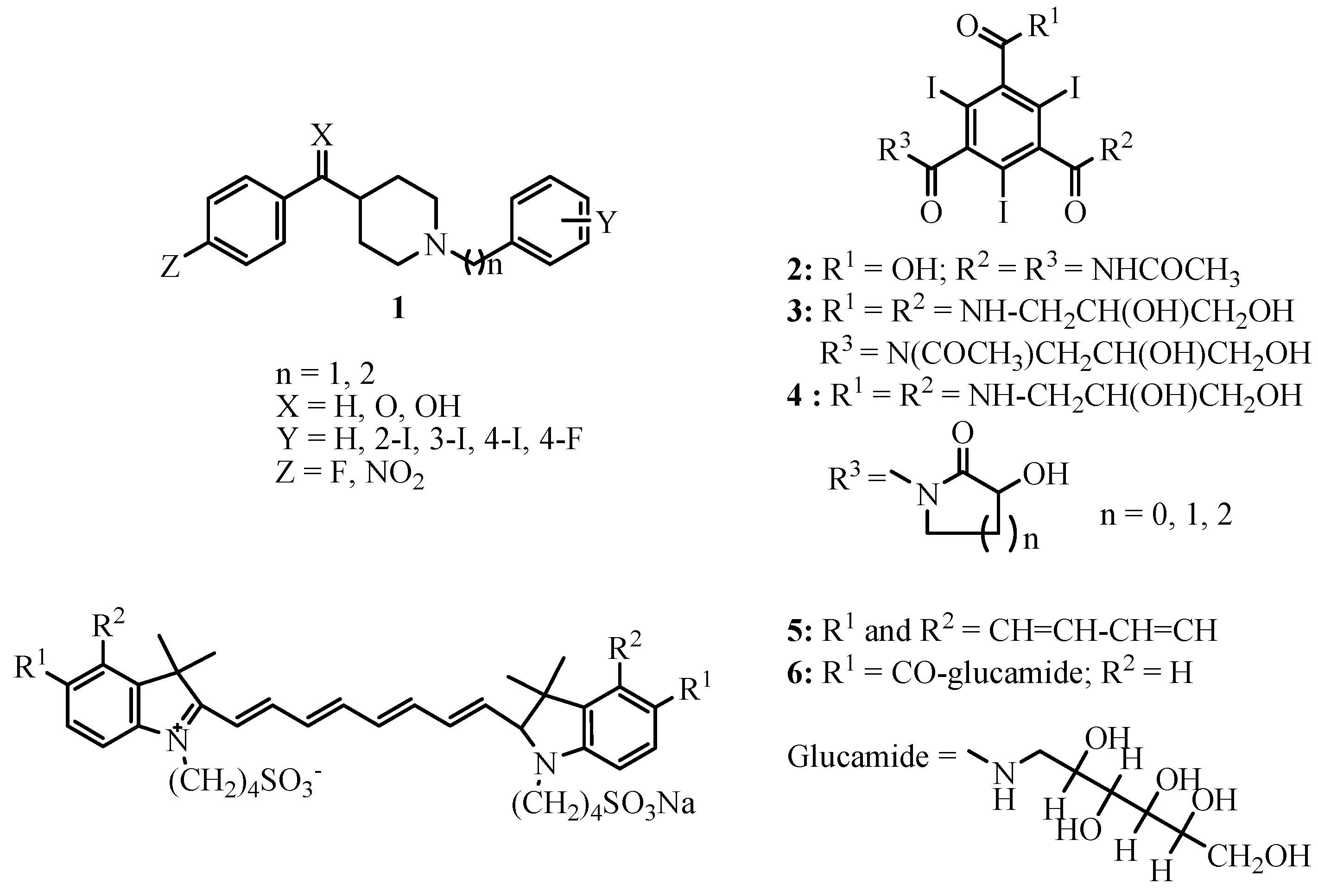 Cardiovascular and neurodegenerative diseases, as well as tumors, are often clinically diagnosed using non invasive methods such as PET (Positron Emission Tomography) [1,2], SPECT (Single Photon Emission Tomography) [2], MRI (Magnetic Resonance Imaging) [3], Optical Imaging [4], ultrasound methods [5] or their multimodal combinations [6]. In many cases all of these methods involve the additional use of specific probes (known as Contrast Agents, CAs) to increase image resolution and discrimination between healthy and pathological areas. Therefore, the development of more sensitive, selective and efficient CAs is an important task of strategic interest due to their potential applications in many biomedical imaging procedures. Classically the widespread presence of heterocyclic rings in Nature and their very favorable coordinating properties have prompted the use of a variety of nitrogen-based heterocycles in the manufacture of many CAs. As a more recent example, Fu et al. [7] have described a new family of benzoylpiperidines 1 (Figure 1) as serotonin 5-HT2A ligands for PET or SPECT Imaging of the brain. Notably, in spite of the considerable progress of MRI and PET protocols, X-Ray Imaging still accounts for 75-80% of all diagnostic imaging procedures. In this respect, non-ionic X-Ray CAs based on the attachment of heterocyclic moieties to the 5-position of diatrizoic acid (2) or iohexol (3) have been reported [8]. Most of these new X-Ray contrast agents consist of sterically congested lactams 4, derived from the 2,4,6-triiodoisophthalamide, which exhibit water solubility, stability and osmolality, depending on the heterocycle included. Approaches based on optical methods are fast emerging as alternatives to conventional X-Ray Imaging. Near Infra-Red light (NIR) is increasingly being considered nowadays as a powerful non-invasive biomedical imaging tool. It is specially recommended as a complementary method to X-ray mammography for examinations of young women with dense breast tissues or patients with scars and implants, often employing NIR absorbing dyes. Indocyanine green (ICG, 5) is a clinically approved NIR dye used for testing of hepatic function and fluorescence angiography in ophthalmology and even for detection of breast tumors [9]. NIR dye 6, a modification of ICG, overcomes many of its limitations with regards to spatial resolution and sensitivity [10].