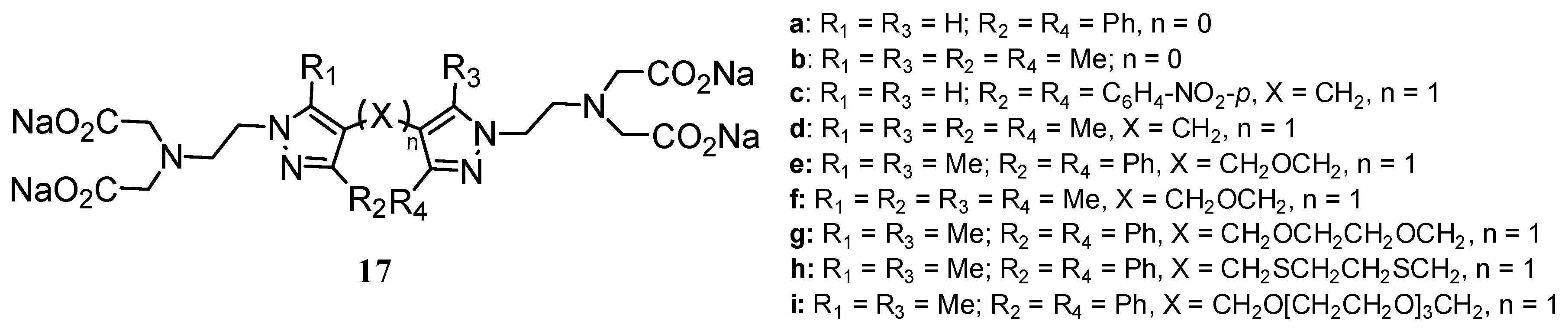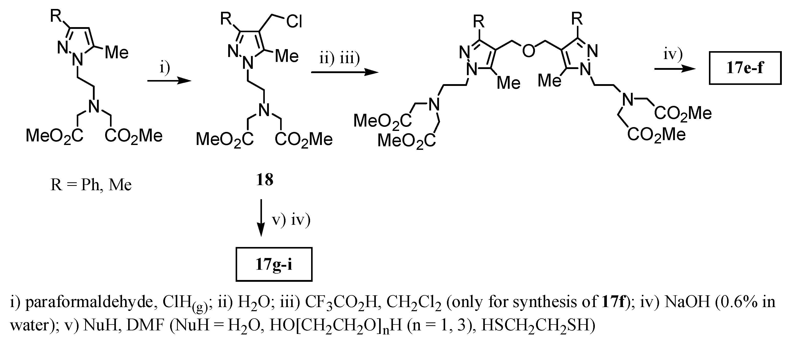 Chelators 17e-i were synthesized from the chloromethyl pyrazoles 18 prepared by condensation of the appropriate pyrazole with paraformaldehyde (Scheme 4) [21].