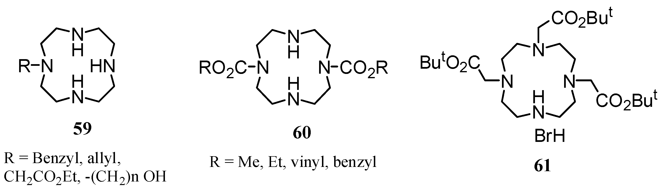 The development of novel generations of macrocyclic CAs for MRI, such as Dota derivatives, is an important area of research because of the higher thermodynamic and kinetic stability of these lanthanide complexes in comparison with the linear CAs [37]. Three important key intermediates are used to prepare macrocyclic ligands based on the cyclen skeleton: monoalkylated cyclen 59 [38], 1,7-disubstituted-1,4,7,10-tetraazacyclododecanes 60 [39] and the 1,4,7-tris(tert-butoxycarbonylmethyl)-1,4,7,10-tetraazacyclododecane hydrobromide salt 61 [40] (Figure 5).