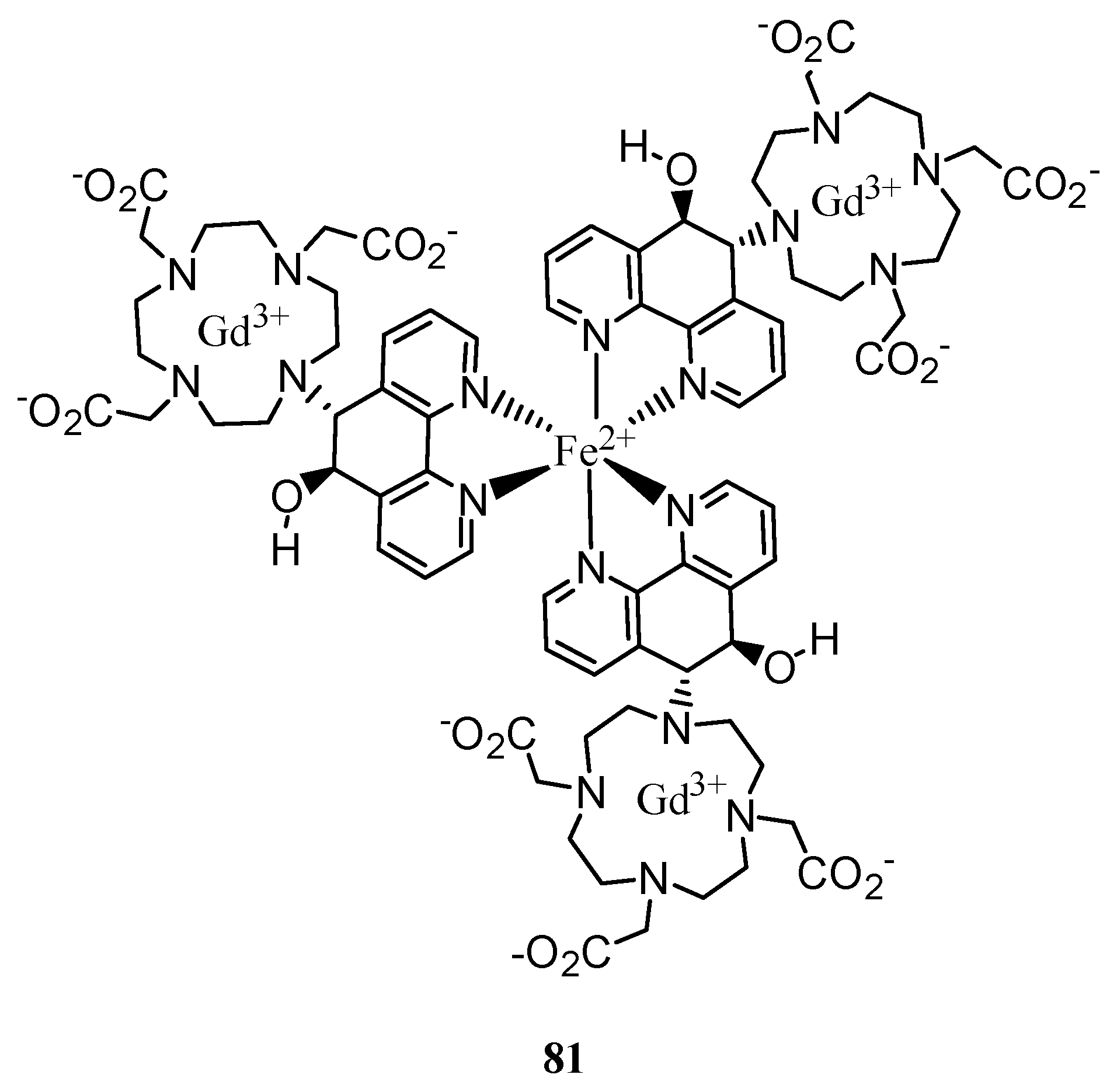 Multinuclear complexes based on 5,6-dihydro-1,10-phenanthrolin-5-yl-DO3A 81 were reported as complexes with higher molecular weights and consequently reduced motion of the complex and increased relaxivity [49] (Figure 7). Complex Gd(III)-81 spontaneously forms highly stable tris-complexes with Fe(II) and Ni(II) characterized because of their relaxivity is not dependent on the temperature in a 5-30 ºC range. Relaxivity values reported for Gd-81 and Fe[Gd-81]3 were 3.7 and 36.6 s-1 mM-1 at 20 MHz and 37 ºC, respectively.
