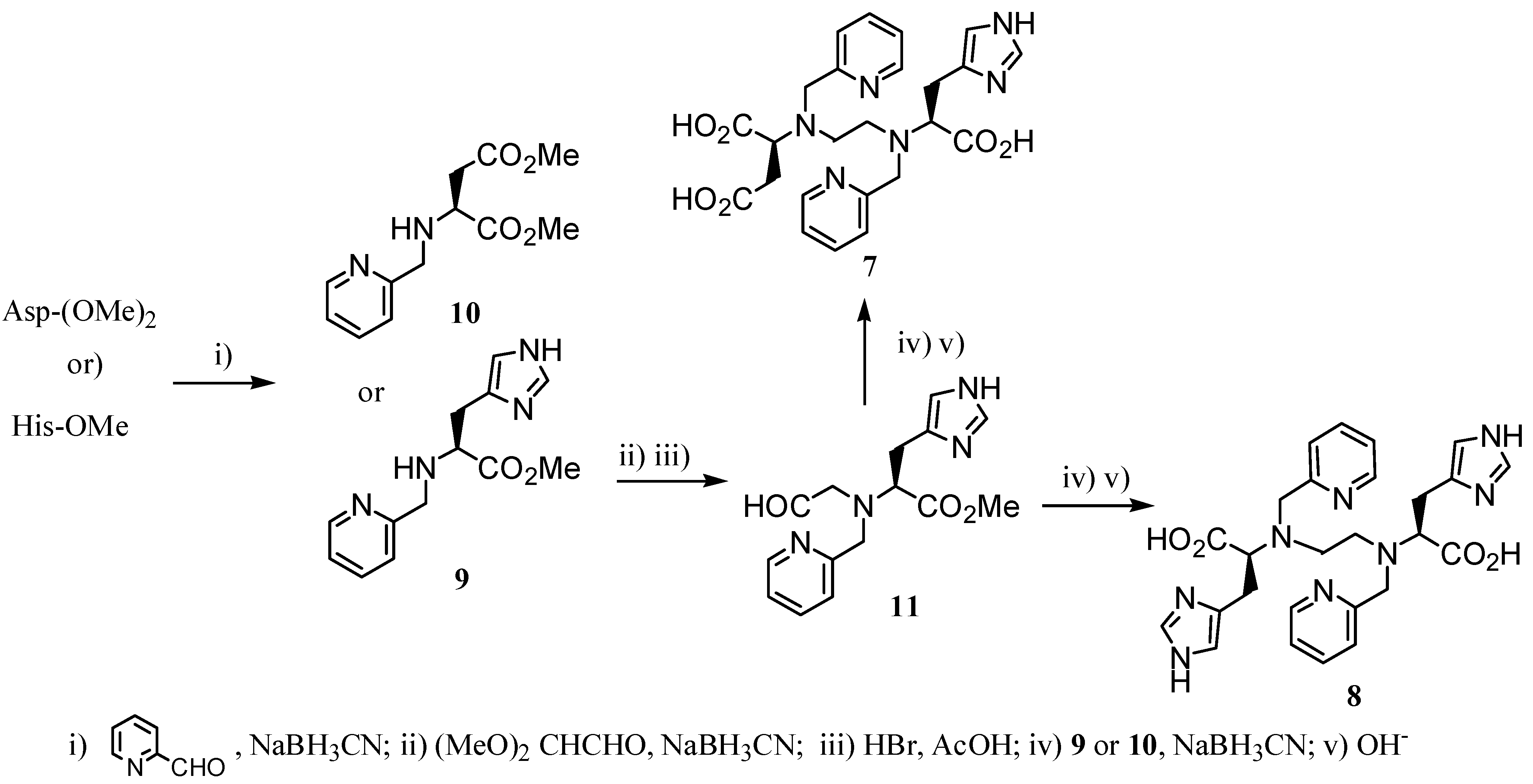 Miyake et al. [15] have reported a new type of optically active acyclic ligands 7 and 8 derived from (S)-aspartic acid and (S)-histidine (Scheme 1). Their Gd(III)-complexes exhibited a high relaxivity (r1 = 9.4 and 9.9 s-1mM-1, respectively, at 300 MHz and 295 K), but their thermodynamic stability was not sufficient to be clinically relevant. Inclusion of pyridine ring was carried out by reductive amination between the corresponding amino acid and pyridine 2-carbaldehyde, affording compounds 9 and 10. Reaction of 9 with 2,2-dimethoxyacetaldehyde in the presence of NaBH3CN, followed by treatment in acidic medium yielded compound 11, which by condensation with 9 or 10 under the mentioned conditions and subsequent basic hydrolysis, afforded the chelating ligands 7 and 8.
