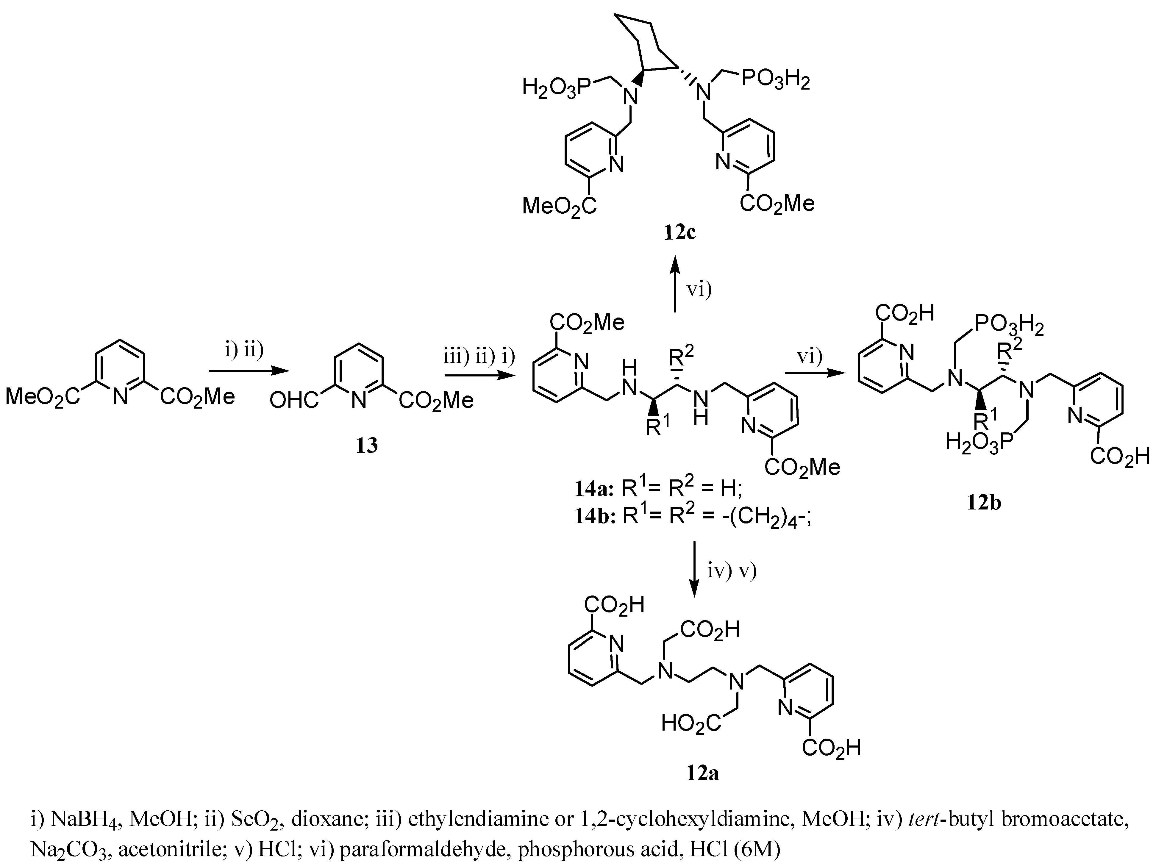 Pyridine derivatives 12a-c, also based on ethylendiamine backbone, were recently reported by Platas-Iglesias et al. (Scheme 2) [16]. Compounds 12a-c were synthesized from 2,6-pyridine-dicarboxylic acid dimethyl ester by reduction of one of the ester groups using NaBH4 in MeOH, followed by oxidation of the corresponding alcohol yielding compound 13. Condensation of 13 with ethylendiamine and subsequent reduction of the imine derivative gave compounds 14a-b. Alkylation of 14a with tert-butyl bromoacetate and deprotection of the ester moieties in acidic medium afforded 12a. Compound 12b was synthesized from precursor 14b by Mannich-type reaction with paraformaldehyde and phosphorous acid in 6 M HCl [17]. Finally, chelate 12c, containing the same structural skeleton with the ethyl bridge substituted by a more rigid cyclohexyl moiety, was prepared using the same synthetic sequence used to prepare 12b (Scheme 2) [18]. Gd-12a induced an r1 value 5.0 s-1mM-1 measured at 20 MHz and 25 ºC.