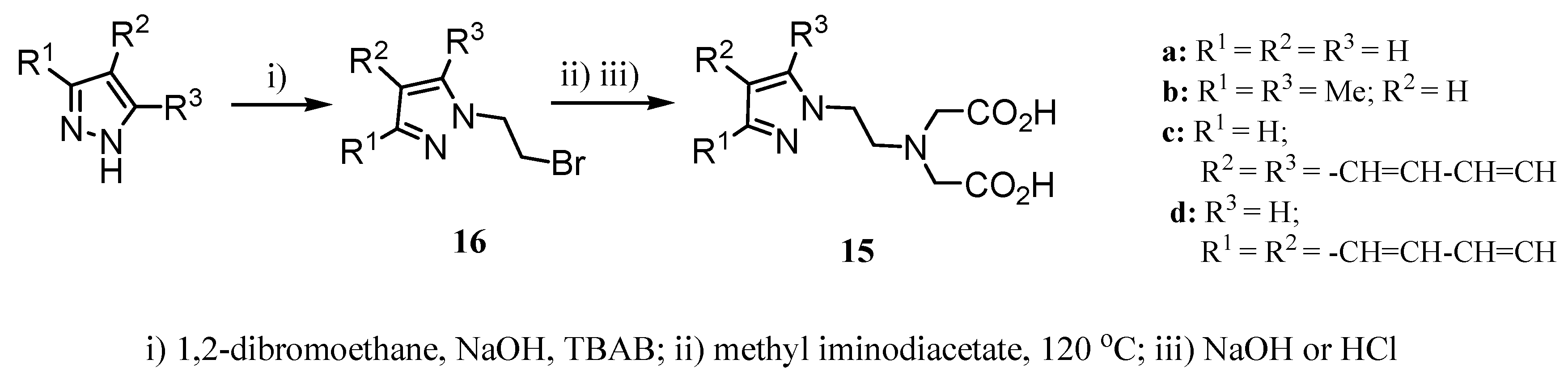 López et al. [19] have reported the synthesis of a novel series of chelating ligands 15 containing nitrogen heterocycles, such as pyrazole and indazole, which form tetradentate complexes with Gd(III). These Gd(III)-complexes were considered as T2 relaxation agents for MRI (r1 4.6-5.9 s-1 mM-1; r2 7.4-13.9 s-1 mM-1 at 360 MHz and 25 ºC). Their synthesis was carried out starting from the corresponding heterocyclic rings by alkylation, using phase transfer conditions, to give compounds 16. Reaction of 16 with methyl iminodiacetate and subsequent acid or basic hydrolysis of the corresponding methyl ester afforded the chelating ligands 15 (Scheme 3).