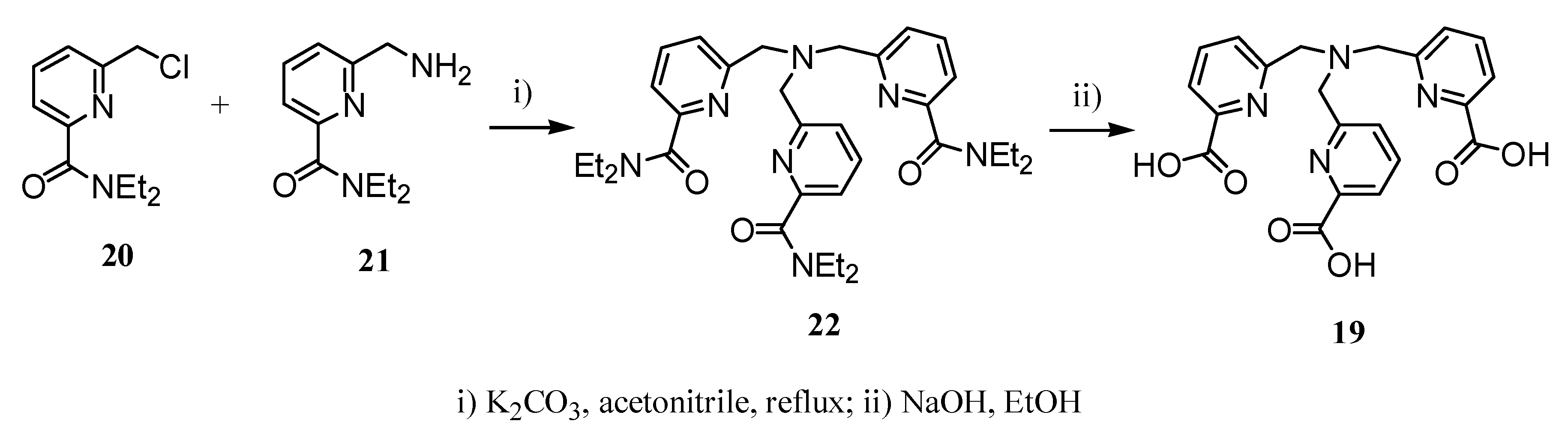 Heptadentate ligand 19 containing three pyridine rings was synthesized in two steps according to Scheme 5. Alkylation of 21 with the pyridylmethyl chloride 20 lead to compound 22, which when treated with NaOH/EtOH afforded the ligand 19. Gd(III)-19 showed an unusual and higher relaxivity with respect to the other heptadentate complexes (13.3 s-1mM-1 measured at 60 MHz and 298 K) [22].