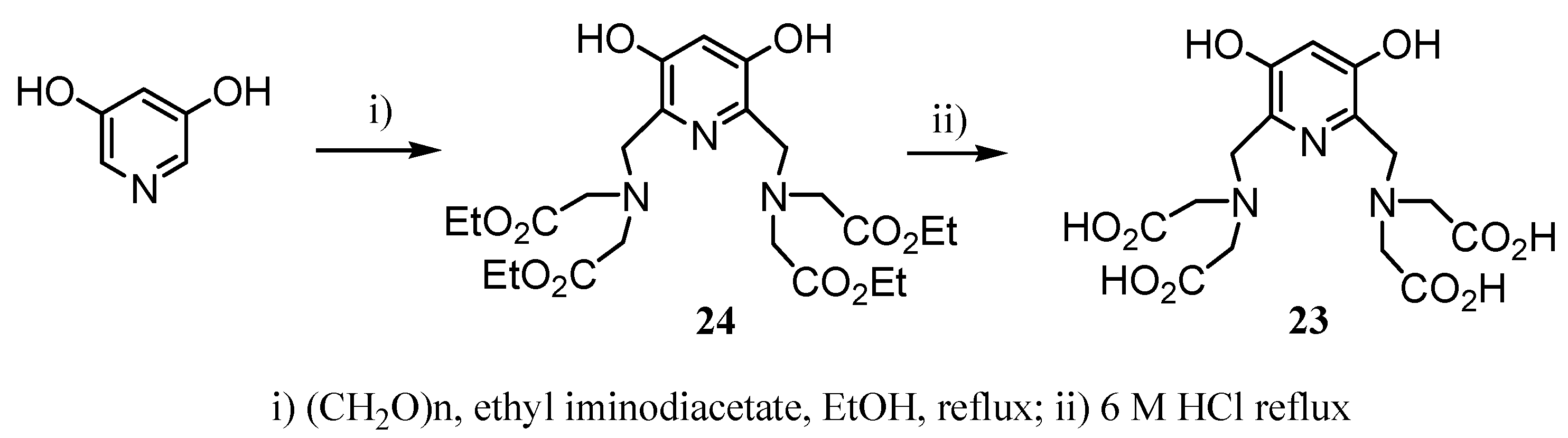 The Gd(III)-complex of ligand 23 with a pyridine ring as part of the triamine skeleton was reported by Aime et al. [23]. This complex showed a high relaxivity (9.1 s-1mM-1 at 20 MHz and 25 ºC) in comparison with other heptacoordinating complexes, probably due to the presence of the hydroxyl groups that contribute to an increase of the second coordination sphere of the complex. Compound 23 was synthesized in two steps through a double-Mannich reaction, as shown in Scheme 6. Thus, reaction of 3,5-dyhydroxypyridine with paraformaldehyde and ethyl iminodiacetate gave compound 24, whose treatment with 6M ClH afforded 23 in good overall yield (56%).