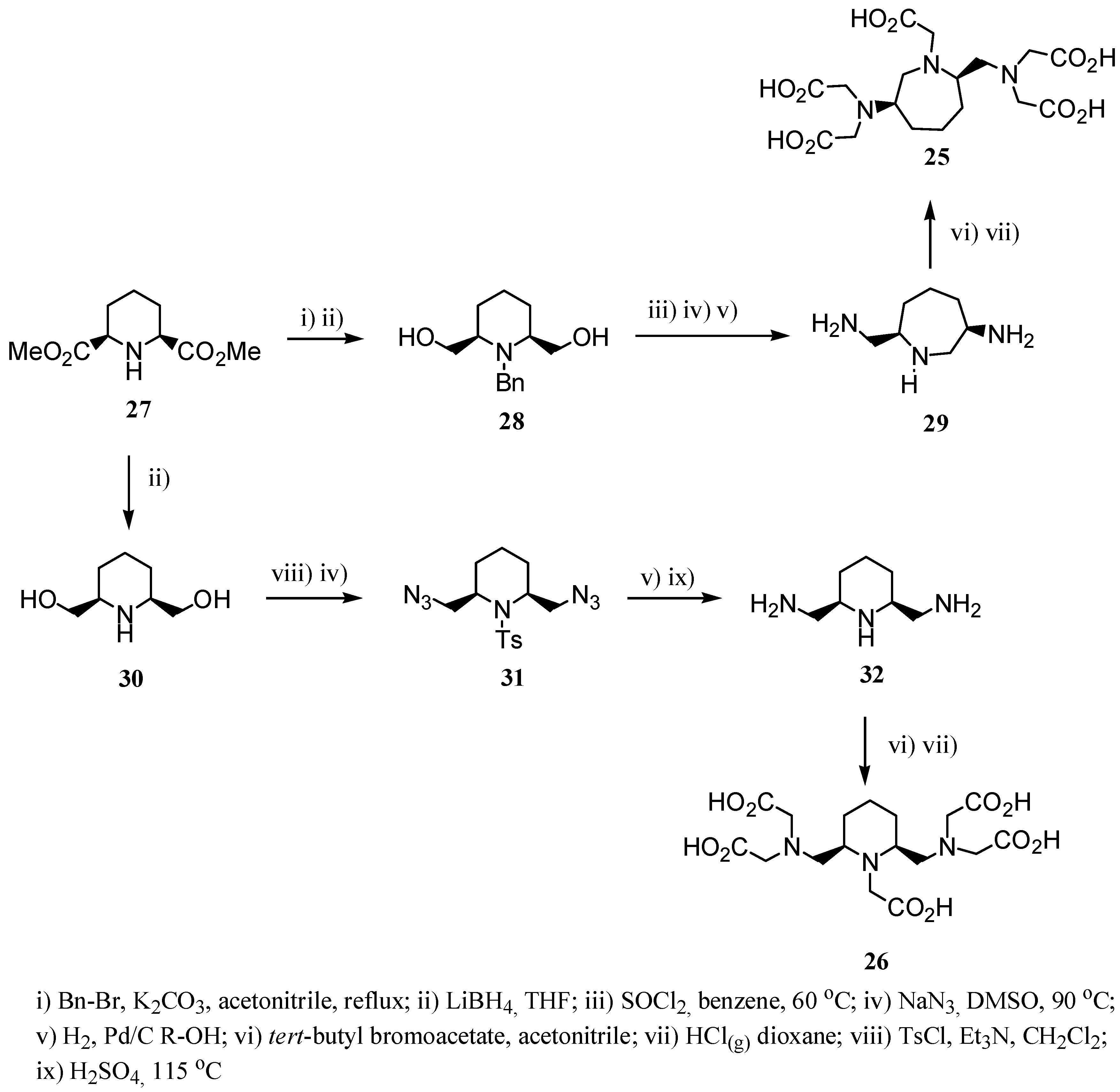 Treatment of 28 with thionyl chloride followed by reaction with sodium azide induces the ring expansion giving the corresponding azide, which was reduced to give the diamine 29. On the other hand, reduction of 27 using LiBH4 lead to compound 30, which by reaction with p-toluensulfonyl chloride followed by treatment with sodium azide gave compound 31. Reduction of the azide groups in compound 31 and subsequent treatment with concentrated H2SO4 afforded diamine 32. Finally, alkylation of 29 and 32 using tert-butyl bromoacetate and subsequent treatment with an acidic medium lead to 25 and 26, respectively.