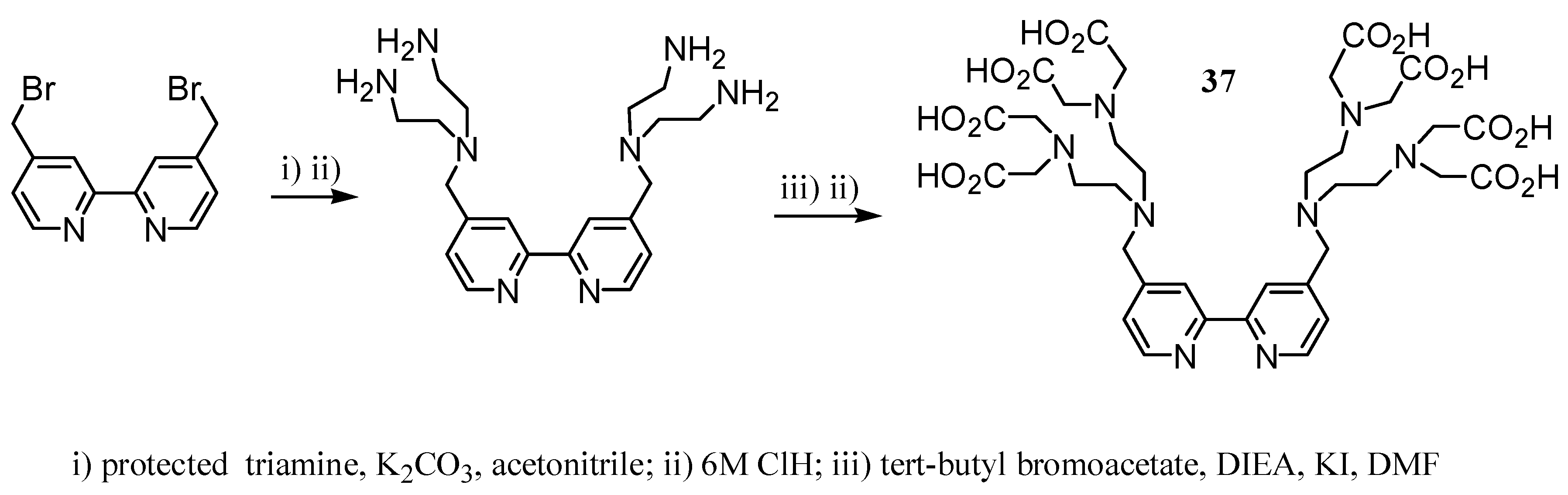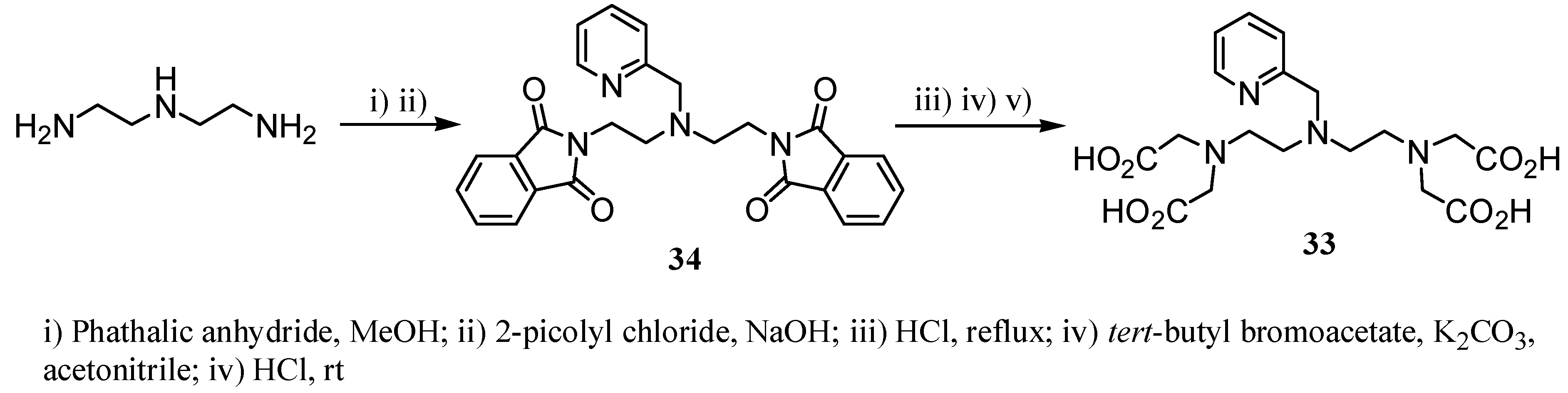 In the same way, Cheng T.-H. et al. [25] reported the Gd(III)-complex of N’-2-pyridylmethyl derivative 33 showing similar relaxivity values (4.2 s-1mM-1 at 20 MHz and 310 K) and stability constants to Gd(III)-dtpa. This ligand was synthesized from diethylenetriamine with protection of the terminal amine groups according to the route shown in Scheme 8. Alkylation of the central nitrogen of the amine backbone gave compound 34, which was sequentially treated with acid, alkylated with tert-butyl bromoacetate and finally hydrolysed in acidic medium yielding ligand 33.